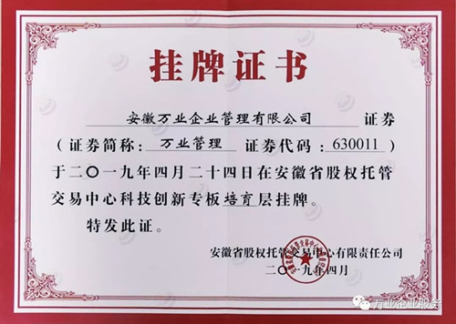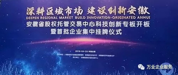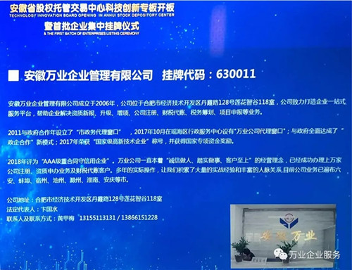 熱烈祝賀安徽萬業(yè)企業(yè)管理有限公司入駐 安徽省股交中心首批科創(chuàng)板企業(yè)!!! 當前,世界范圍內(nèi)正在孕育新一輪科技革命和產(chǎn)業(yè)變革,全球化競爭呈現(xiàn)出新的發(fā)展態(tài)勢,主要發(fā)達國家和創(chuàng)新型國家相繼出臺重大舉措,加快推動產(chǎn)業(yè)科技創(chuàng)新。 政策支持 2019年4月24日安徽《聚焦高新產(chǎn)業(yè)“硬科技”打造上市融資“孵化器”》安徽首批787家皖企掛牌科創(chuàng)專板在合肥濱湖新區(qū)圣盛大開板。省財政對在省股權(quán)托管交易中心科創(chuàng)板掛牌企業(yè)給予一次性獎補10萬元,完成改革并掛牌的再獎補10萬元,2年內(nèi)一共拿出3.3個億對企業(yè)實施獎補,并鼓勵市、縣配套定制獎補政策。 “科創(chuàng)板”介紹 科創(chuàng)板是由國家主席習近平于2018年11月5日在首屆中國國際進口博覽會開幕式上宣布設(shè)立,是獨立于現(xiàn)有主板市場的新設(shè)板塊,并在該板塊內(nèi)進行注冊制試點。 萬業(yè)公司簡介 安徽萬業(yè)企業(yè)管理有限公司成立于2006年。萬業(yè)公司一直本著“誠信做人、踏實做事、客戶至上”的經(jīng)營理念,已經(jīng)成功辦理上萬家公司注冊、資質(zhì)申辦業(yè)務(wù)及財稅代賬客戶上千家。多年的實際操作,讓我們積累了大量的實戰(zhàn)經(jīng)驗和豐富的人脈關(guān)系,公司擁有一批精通建筑業(yè)資質(zhì)申報知識、精通工商稅務(wù)行業(yè)及項目申報等專業(yè)精英。 安徽萬業(yè)掛牌 2019年4月24日這一天,安徽萬業(yè)企業(yè)管理有限公司成功入駐安徽省股交中心首批科創(chuàng)板企業(yè),掛牌證券代碼:630011,這是值得被紀念的一天,是一個新的歷史上的里程碑! 愿景 萬業(yè)公司將站在一個更高的平臺與殊譽,致力于做好企業(yè)一站式服務(wù)平臺——所有平臺內(nèi)的業(yè)務(wù)將“一對一”客服經(jīng)理專業(yè)對接,一直追求與客戶建立長期穩(wěn)定的合作伙伴關(guān)系,為客戶提供熱誠、快捷、周到的服務(wù)! 企業(yè)一站式服務(wù)平臺 長按,識別二維碼,加關(guān)注 工商注冊、財稅代賬、審計評估、財務(wù)咨詢、商標專利、資質(zhì)審批、人才獵頭、人才報名、金融保險、信用評級、法務(wù)咨詢、項目申報 公司網(wǎng)站:m.tgwd.com.cn 聯(lián)系方式:400-0551-976 合肥總部:安徽省合肥市南一環(huán)與馬鞍山路交口恒興廣場A座24樓 分部:合肥市行政服務(wù)中心一樓“萬業(yè)公司代理窗口”(工商局窗口正對面) 分部:合肥市瑤海區(qū)行政服務(wù)中心一樓“萬業(yè)公司代理窗口”(工商局窗口正對面) 蕪湖分部:蕪湖市鏡湖區(qū)偉星時代金融中心610室 (申經(jīng)理:189-0560-8966)