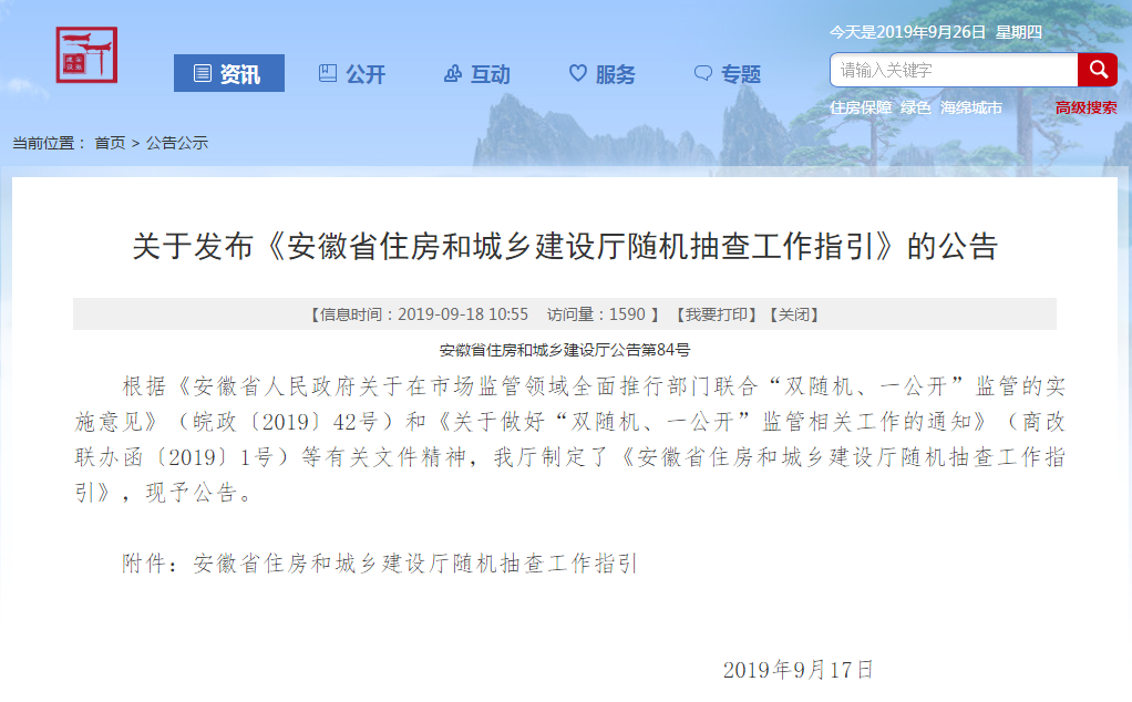 近日,安徽省住房和城鄉建設廳根據《安徽省人民政府關于在市場監管領域全面推行部門聯合“雙隨機、一公開”監管的實施意見》(皖政〔2019〕42號)和《關于做好“雙隨機、一公開”監管相關工作的通知》(商改聯辦函〔2019〕1號)等有關文件精神,制定了《安徽省住房和城鄉建設廳隨機抽查工作指引》