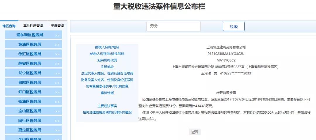 2、上海XX建筑勞務有限公司,經國家稅務總局上海市稅務局第三稽查局檢查,發現其在2017年07月04日至2018年03月30日期間,主要存在以下問題:對外虛開普通發票51份,票面額累計434.48萬元。依照《中華人民共和國稅收征收管理法》等相關法律法規的有關規定,對其處以罰款50.00萬元的行政處罰,并依法移送司法機關。