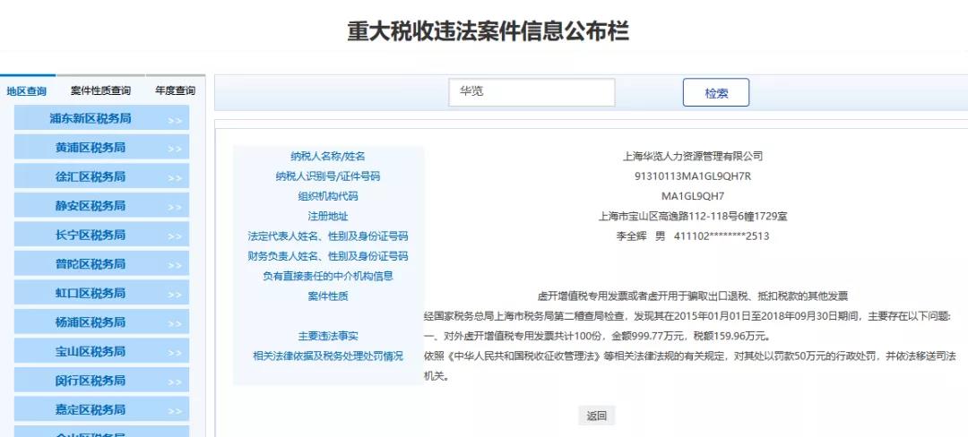 4、上海XX人力資源管理有限公司,經國家稅務總局上海市稅務局第二稽查局檢查,發現其在2015年01月01日至2018年09月30日期間,主要存在以下問題:對外虛開增值稅專用發票共計100份,金額999.77萬元,稅額159.96萬元。依照《中華人民共和國稅收征收管理法》等相關法律法規的有關規定,對其處以罰款50萬元的行政處罰,并依法移送司法機關。