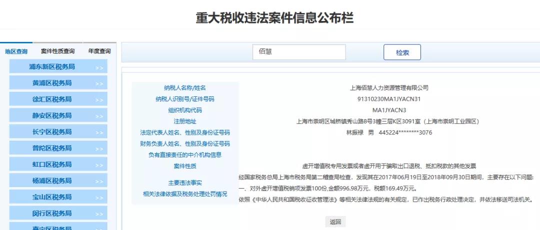 5、上海XX人力資源管理有限公司,經國家稅務總局上海市稅務局第二稽查局檢查,發現其在2017年06月19日至2018年09月30日期間,主要存在以下問題:對外虛開增值稅銷項發票100份,金額996.98萬元,稅額169.49萬元。依照《中華人民共和國稅收征收管理法》等相關法律法規的有關規定,已作出稅務行政處理決定,并依法移送司法機關。