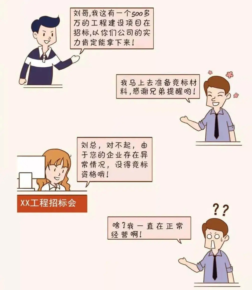 僅剩 7天 02企業合作信用受疑 現在是信用社會,信用對于人和企業來說都至關重要,大家都喜歡和有信用的人交往、合作。 被列入經營異常名錄,你看看誰還找你合作! 03經營活動受限 經營異常名錄信息現在也是 銀行等金融機構貸款、擔保等金融活動的 參考依據 老板 你好,我去年年報忘記報,現在被列入經營異常名錄,本來想著在阿里巴巴注冊一個網店,在網上做點小生意,結果被告知因為企業是經營異常名錄,注冊不了,這可怎么辦呀! 你好,首先應在國家企業信用信息公示系統補報年報,然后再準備好相關材料去當地市場監管部門申請移出哦。 小編 老板 好的,萬萬沒想到沒報年報的后果竟然這么嚴重,嚴重影響了我的經營活動,我真是后悔莫及。 是的,企業被列入經營異常名錄,那就有了信用污點,必須高度重視哦!對了,2019年度的年報馬上也要截止啦,請及時申報哦。 小編 老板 2019年度的年報我們公司馬上準備申報了,經過這次,以后一定不會忘了及時年報! 建議您盡早進行年報,避免因月底網站擁堵或企業自身數據方面準備不充分造成年報延遲。 小編 04列入嚴重違法企業名單 最最最嚴重的后果來啦! 列入經營異常名錄三年還沒有履行信息公示義務的企業,將被列入嚴重違法失信企業名單 企業五年內不能申請移出嚴重違法失信名單,法定代表人、負責人也將受到牽連,三年內不得擔任其他企業的法定代表人、負責人! 企業一站式服務平臺 工商注冊、財稅代賬、審計評估、稅務籌劃、商標專利、資質審批、人才獵頭、人才報名、金融保險、信用評級、法務咨詢、項目申報 公司網站:m.tgwd.com.cn 聯系方式:400-0551-976 合肥總部:安徽省合肥市南一環與馬鞍山路交口恒興廣場A座24樓 分部:合肥市行政服務中心一樓“萬業公司代理窗口”(工商局窗口正對面) 分部:合肥市瑤海區行政服務中心一樓“萬業公司代理窗口”(工商局窗口正對面)
