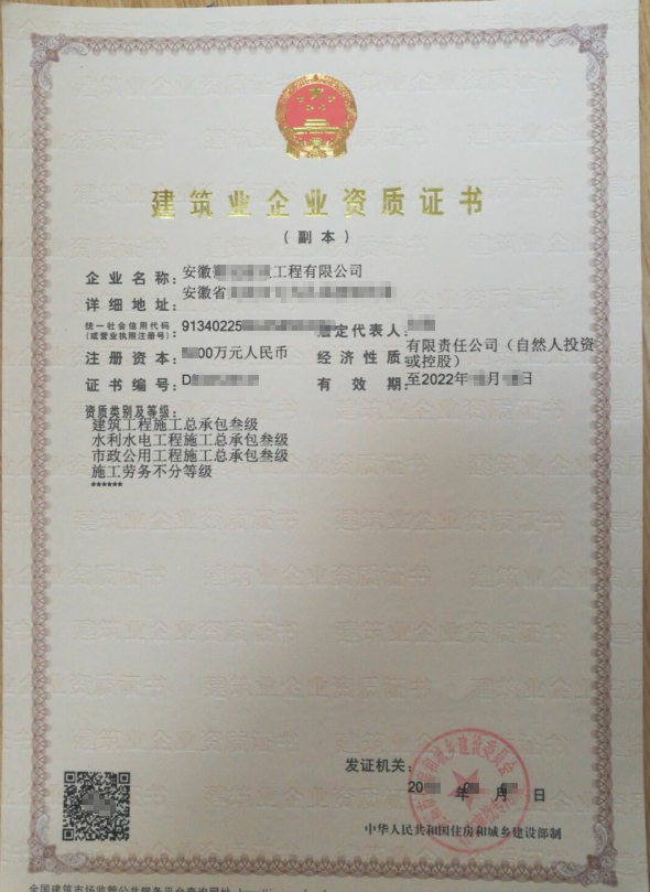級別:建筑工程總包三級+水利水電三級+市政三級+施工勞務不分等級